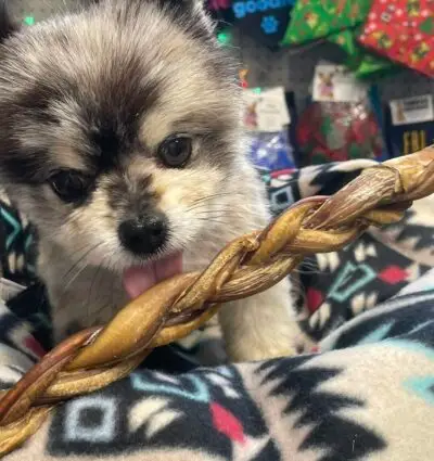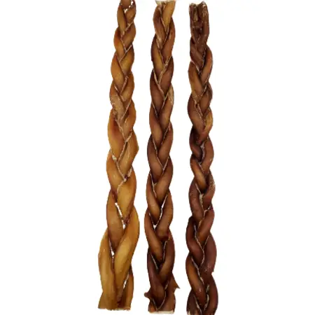 12″ Braided Thick Bully Sticks are tough and long lasting natural chews and great for active chewers.